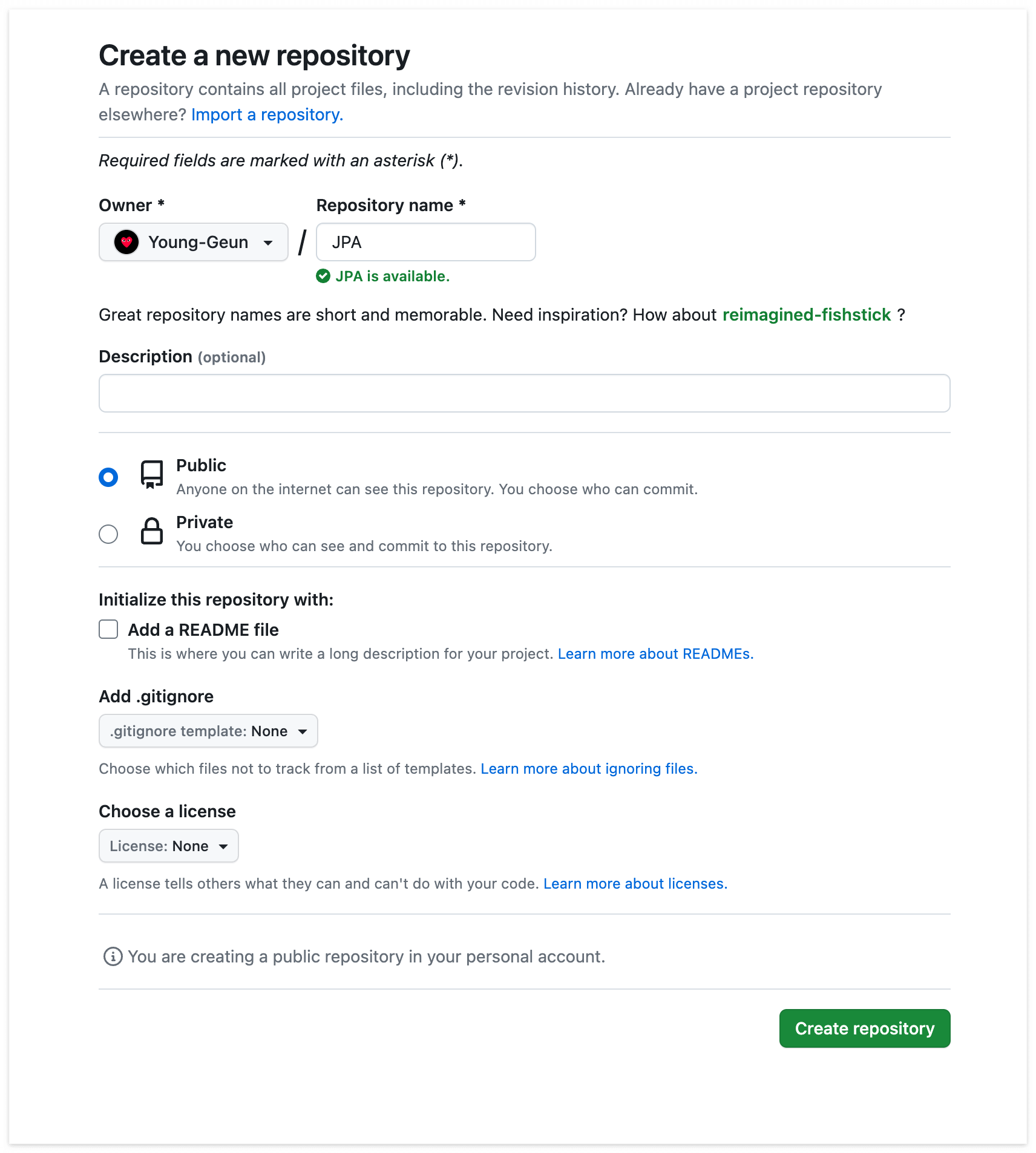 Ex) git remote add origin https://github.com/Young-Geun/JPA.git