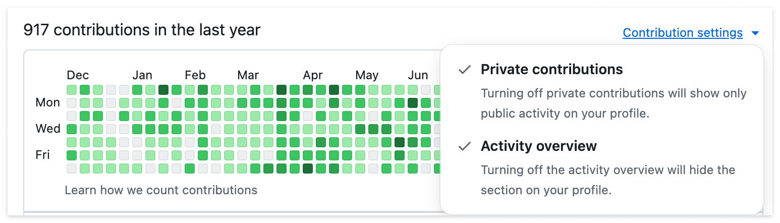메인화면의 잔디영역에서 'Contribution settings'를 클릭하고, Private contributions를 체크한다.
