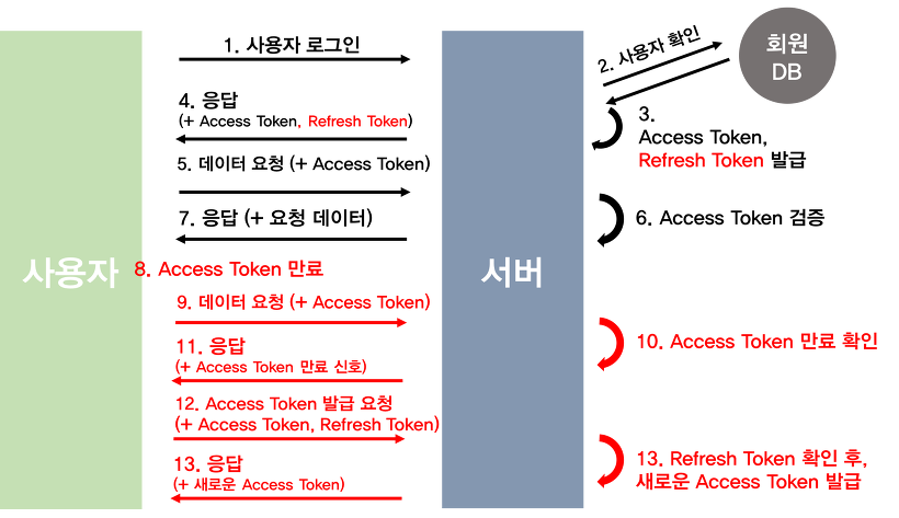 - Refresh토큰 : 만료기간이 짧은 Access토큰을 재발급받기 위한 토큰으로 생명주기가 보다 길다.