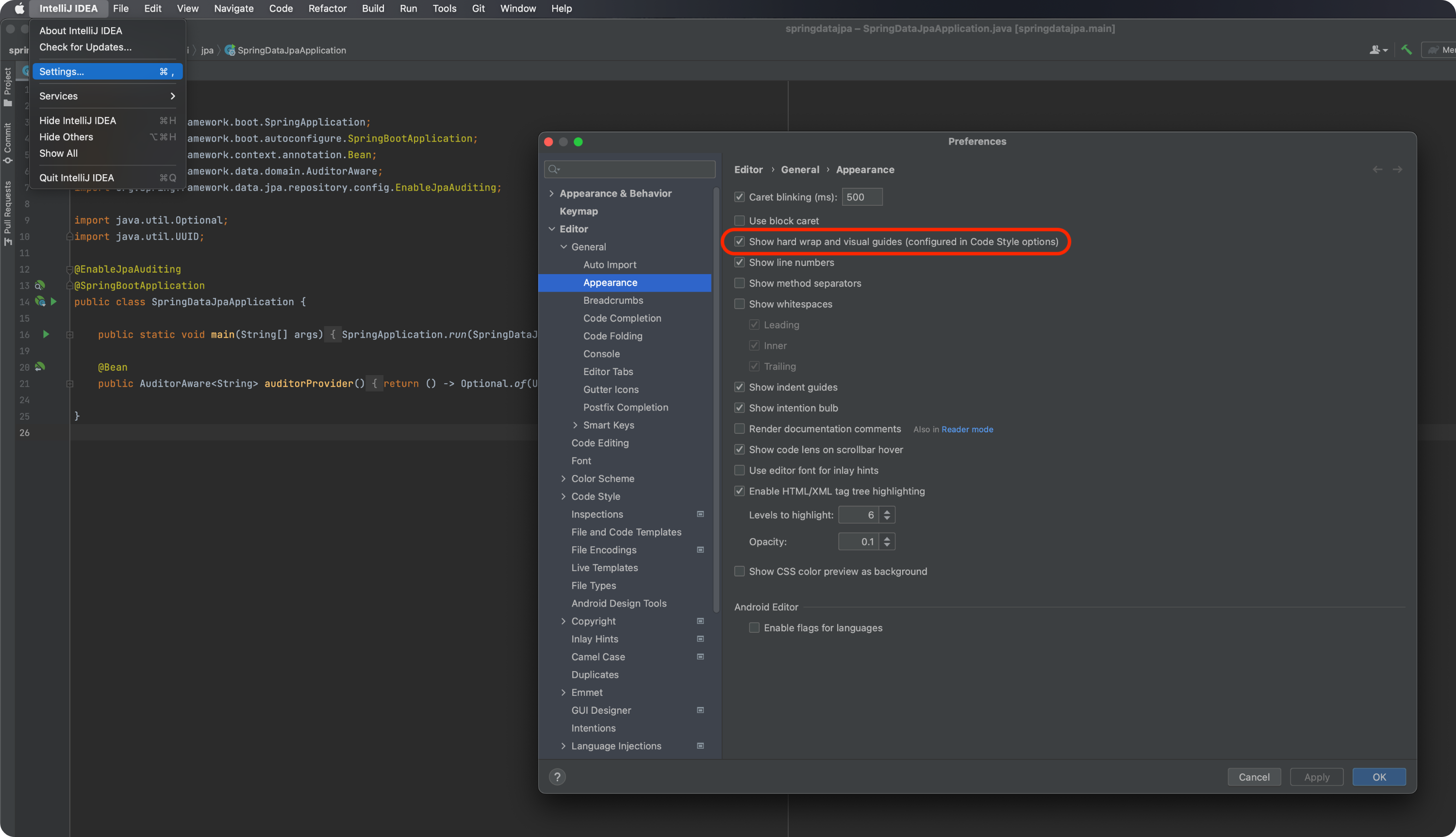 - Preferences 창 > Editor > General > Appearance에서 'Show hard wrap and visual guides' 항목을 해제한다.
