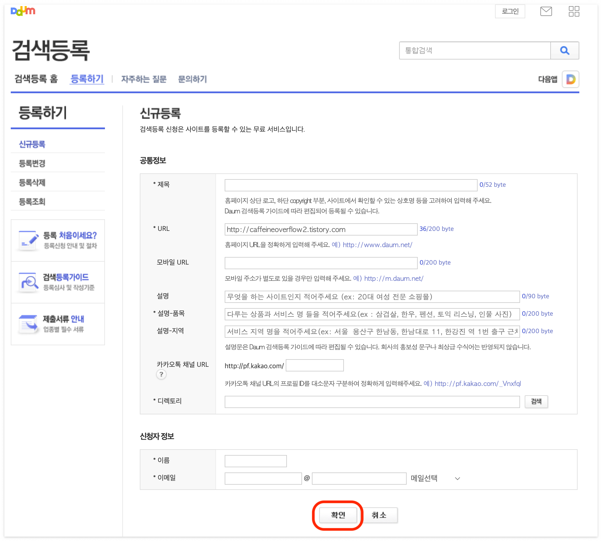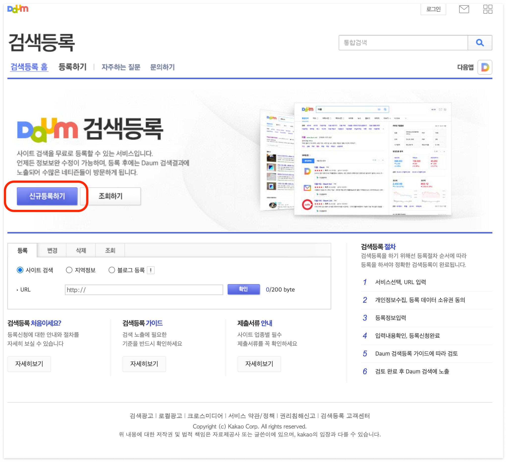 1. Daum 검색등록 페이지로 이동 후 [신규등록하기] 버튼을 클릭한다.