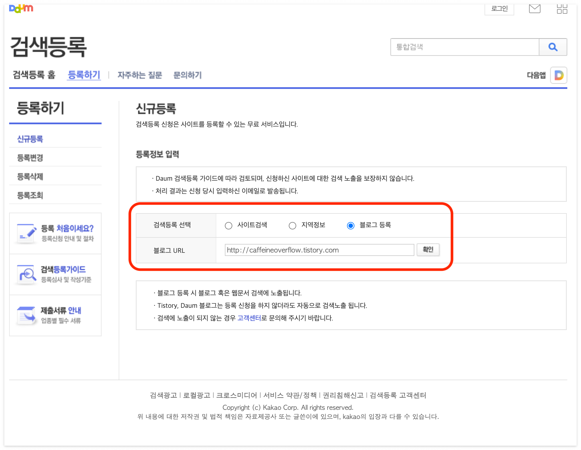 (단, 티스토리의 경우는 등록 신청을 하지 않아도 자동으로 검색노출 된다.)